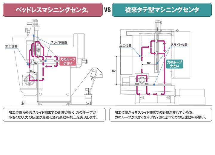 主軸加工部とワークを固定する治具等、非加工部とを同一部品に取り付けたことで、力のループが短くなり高剛性を発揮します。